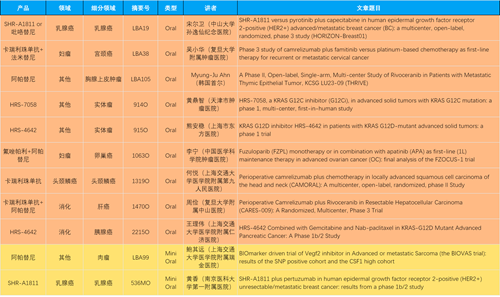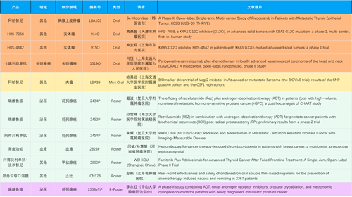 本届大会,作为中国医药创新代表性企业的PG医药共有46项抗肿瘤领域研究成果入围,包括4项最新突破性摘要(LBA)1,共涉及14项创新药。其中9项入选口头(Oral)报告,2项入选简短口头报告(Mini Oral),32项研究接收为壁报(Poster),3项研究接收为电子壁报(E-Poster),覆盖食管胃癌、妇科肿瘤、肝癌、乳腺癌、胰腺癌、肺癌、肉瘤、胆道癌、头颈鳞癌、前列腺癌、甲状腺癌等十余个领域。14款创新药包括10款已上市产品:注射用瑞康曲妥珠单抗(艾维达®,研发代号:SHR-A1811)、注射用卡瑞利珠单抗(艾瑞卡®)、苹果酸法米替尼胶囊(艾比特®)、甲磺酸阿帕替尼片(艾坦®)、马来酸吡咯替尼片(艾瑞妮®)、阿得贝利单抗注射液(艾瑞利®)、羟乙磺酸达尔西利片(艾瑞康®)、氟唑帕利胶囊(艾瑞颐®)、瑞维鲁胺片(艾瑞恩®)、海曲泊帕乙醇胺片(恒曲®),以及4款未上市产品,包括KRASG12C抑制剂HRS-7058、KRASG12D抑制剂HRS-4642、抗PD-L1/TGF-βRII双抗瑞拉芙普-α注射液(SHR-1701)、Trop-2 ADC SHR-A1921。2类新药盐酸伊立替康脂质体注射液(II)(越优力®)及国内首仿药昂丹司琼口溶膜(艾其速®)各有1项研究入选。